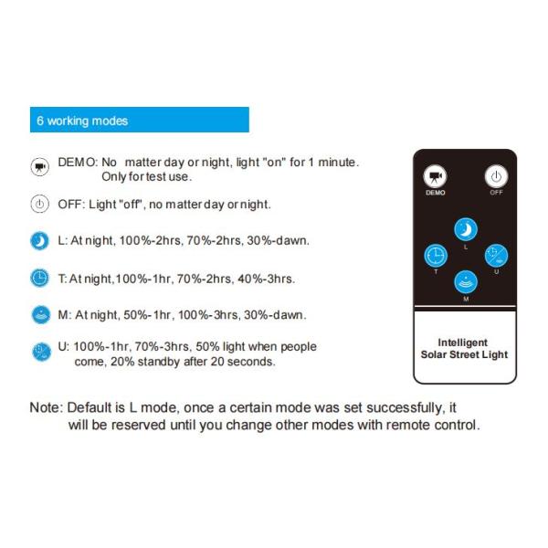 | 60 | 7800 | 1344*370*35mm | 160AH*3.2V | 80W+16W | Demo: No matter day or night, light "on" for 1 minute. Only for test use. OFF: Light “off", no matter day or night. L: At night, 100%-2hrs, 70%-2hrs, 30%-dawn. T: At night,100%-1hr, 70%-2hrs, 40%-3hrs. M: At night, 50%-1hr, 100%-3hrs, 30%-dawn. U: 100%-1hr, 70%-3hrs, 50% light when people come, 20% standby after 20 seconds. Note: Default is L mode, once a certain mode was set successfully, it will be reserved until you change other modes with remote control. | 3000-6500K optional |